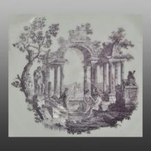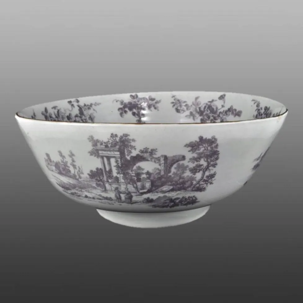 Worcester punch bowl with scenes of classical ruins in light purple. The scene shown on this side is known as Shepherd and Shepherdess (reference; Cook, Cyril. The life and work of Robert Hancock, item 169). At 11 inches, this bowl it was about the maximum size that Worcester could fire successfully at the time. Note that this bowl was decorated even though it noticeably slumped in the kiln and is out of round.