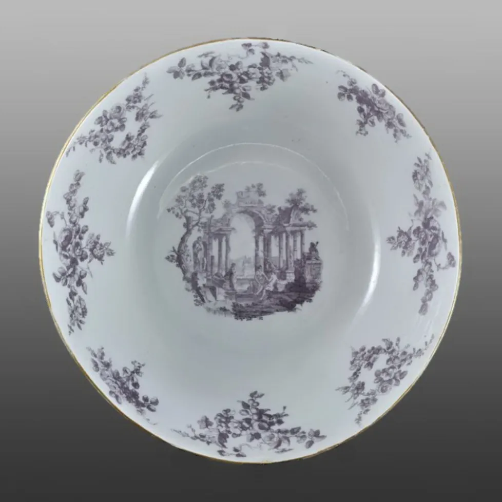Worcester punch bowl with scenes of classical ruins in light purple. The scene shown on this side is known as Shepherd and Shepherdess (reference; Cook, Cyril. The life and work of Robert Hancock, item 169). At 11 inches, this bowl it was about the maximum size that Worcester could fire successfully at the time. Note that this bowl was decorated even though it noticeably slumped in the kiln