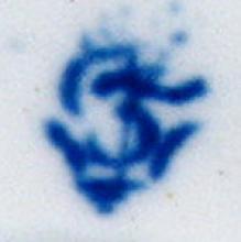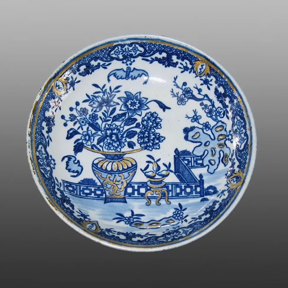 This porcelain saucer was printed in the Bat, also known as the Vase, pattern with gilt decoration added overglaze. It is marked with the disguised numeral "3".