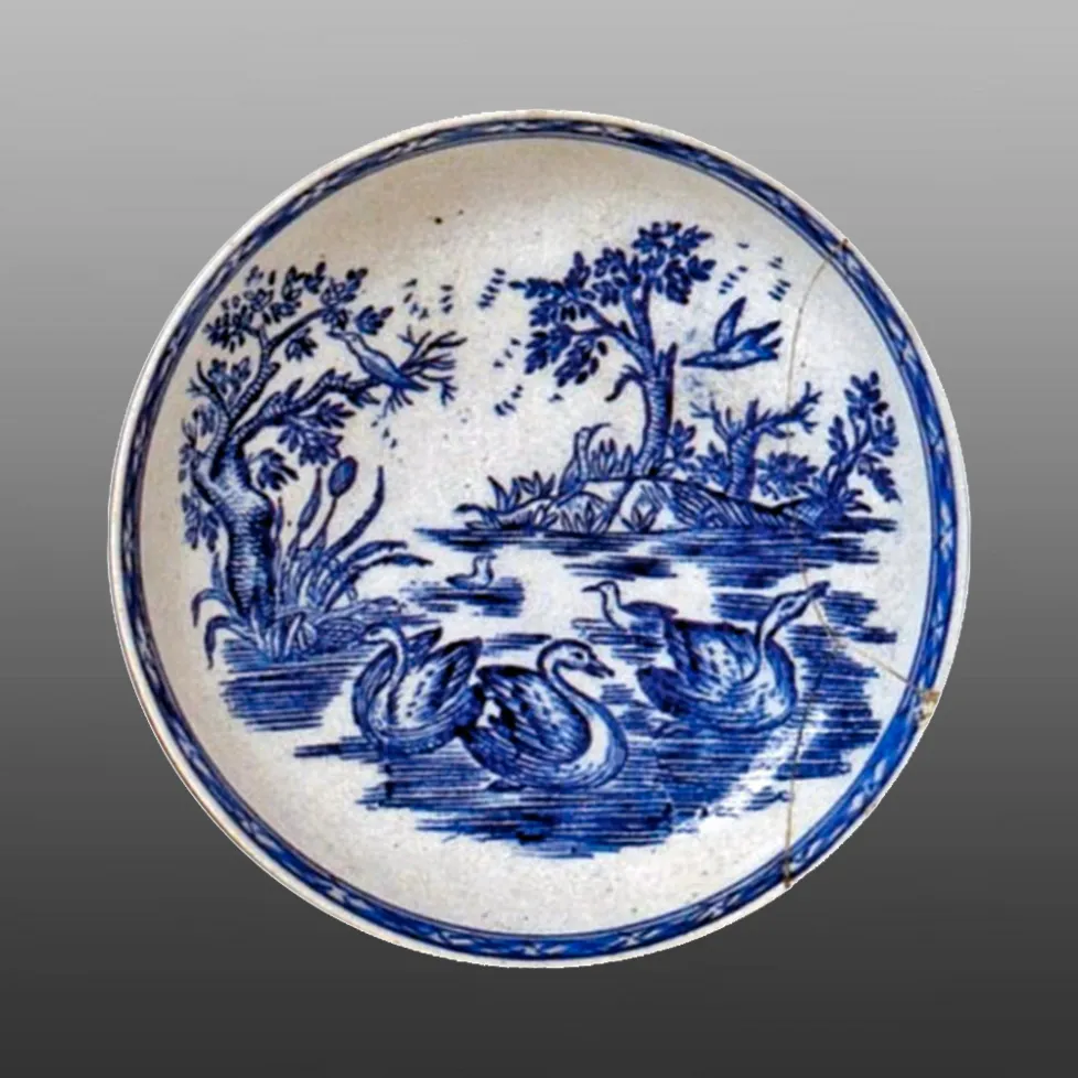 This Isleworth saucer is printed with The Three Swans pattern that depicts them swimming in the foreground, with other birds amongst island trees in the background. This attractive print is rare. The trellis border is painted. This saucer was in the Watney collection. A shard printed with this pattern was recovered close to the factory site.BACK TO CATALOG INDEX