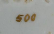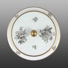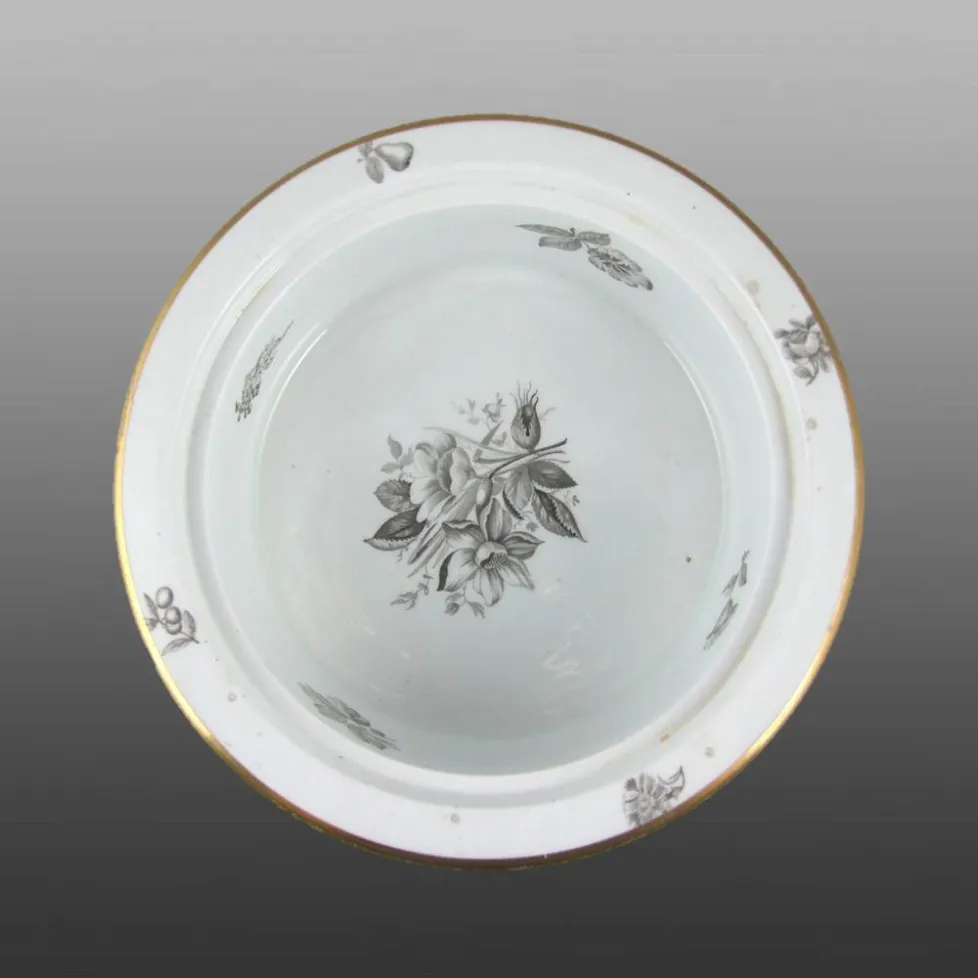 A flat covered centre piece from a circular supper set in pattern number 500. Bat printed in charcoal grey with print numbers P.101, P.102 and P.111 on the dish and print numbers P.102, P.108 and P.126-2 on the lid from the Flowers and Fruit Series. Additional gilded bands on each piece. Print reference Drakard, David and Holdway, Paul. Spode Transfer Printed Ware, 1784-1833. Woodbridge, Suffolk, Antique Collector's Club, Inc., 2002.