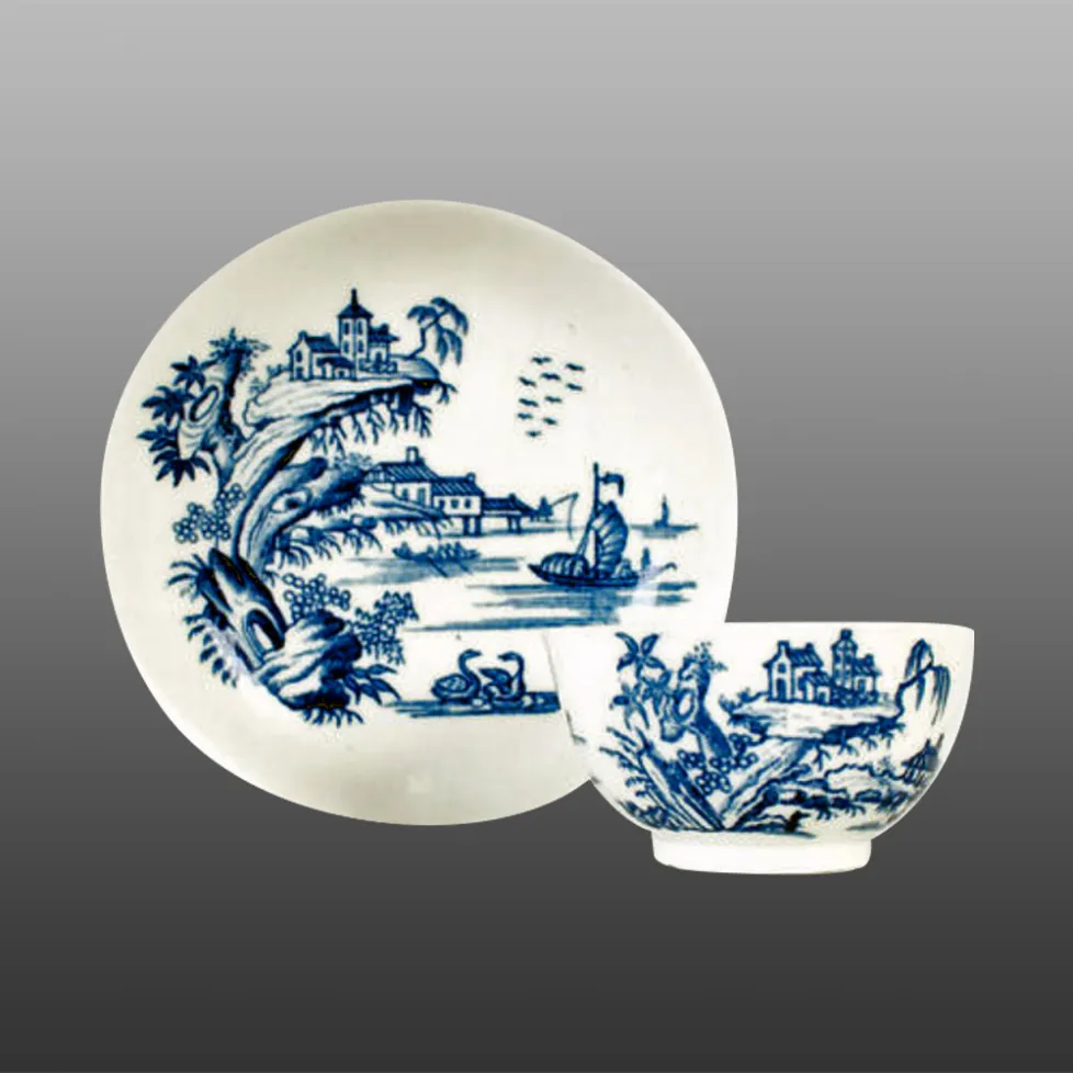 This teabowl and saucer is decorated with an early transfer print of a chinoiserie landscape called the Two Swan Precipice. This is one of a group of early underglaze blue prints used at Worcester. Most, like this pattern, are now very rarely found.BACK TO CATALOG INDEX