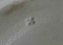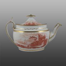 A new oval shape teapot and cover, in pattern number 557, bat printed in red with print numbers P.226 and P.206 on the body and print numbers P.224 and P.225 on the lid, from the Landscapes Series.  Additional band and line gilding overglaze.  Unmarked with the exception of an impressed cross (possible early felspar mark).  Print reference Drakard, David and Holdway, Paul. Spode Transfer Printed