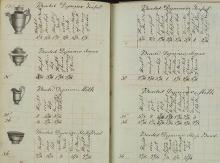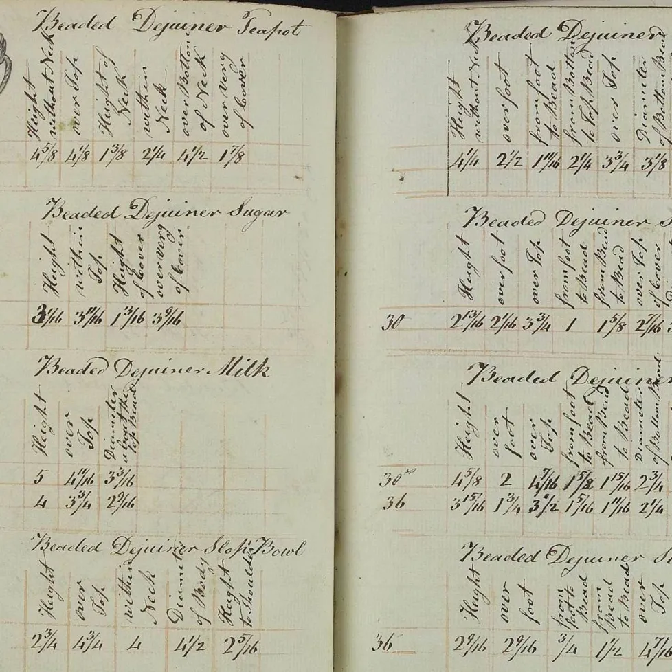 Shown here is page 130 of the Spode 1820 Shape Book which includes four shapes for the dejeuner pieces with measurements.