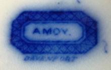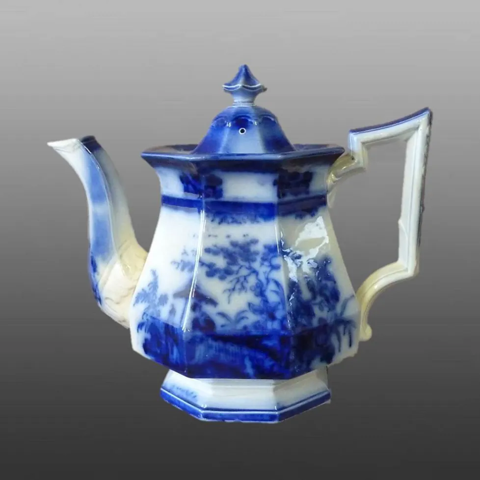 An earthenware octagonal shaped teapot printed in flow blue in the Amoy pattern.BACK TO CATALOG INDEX