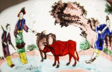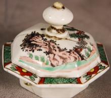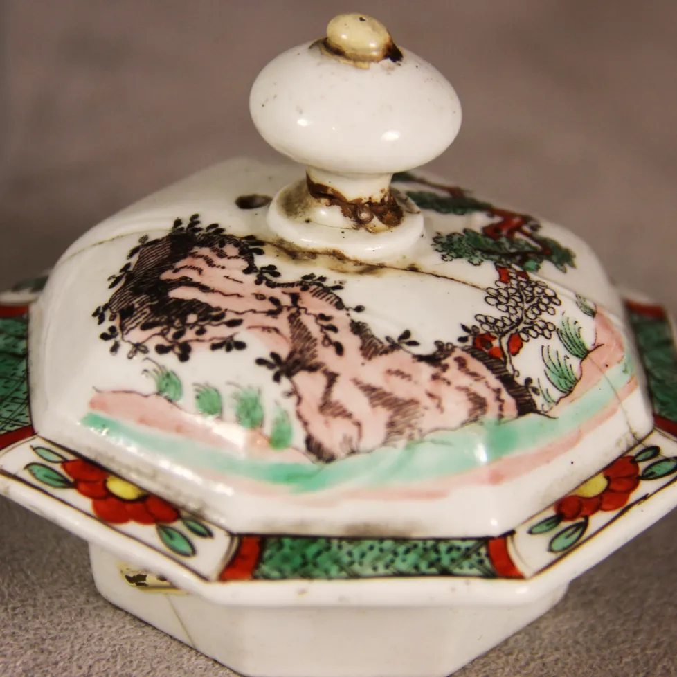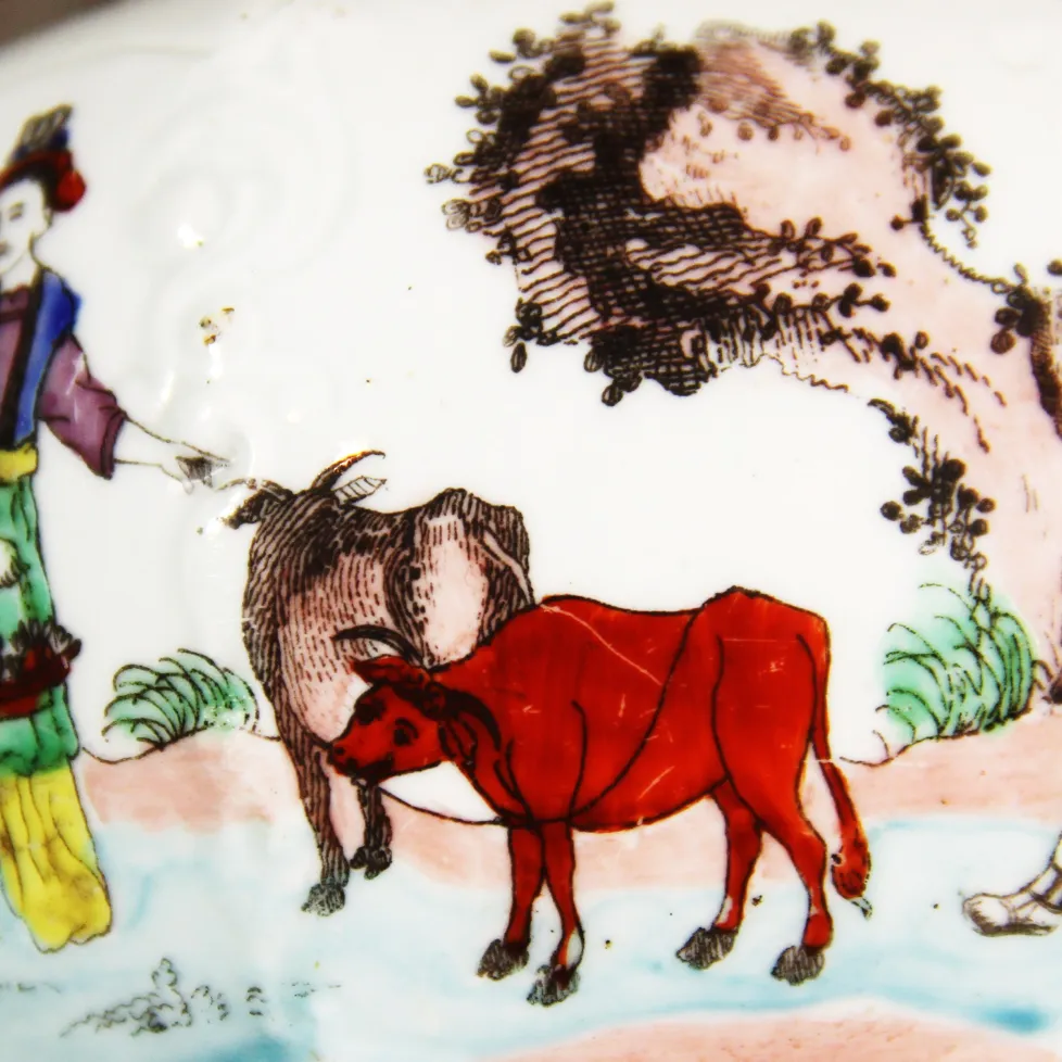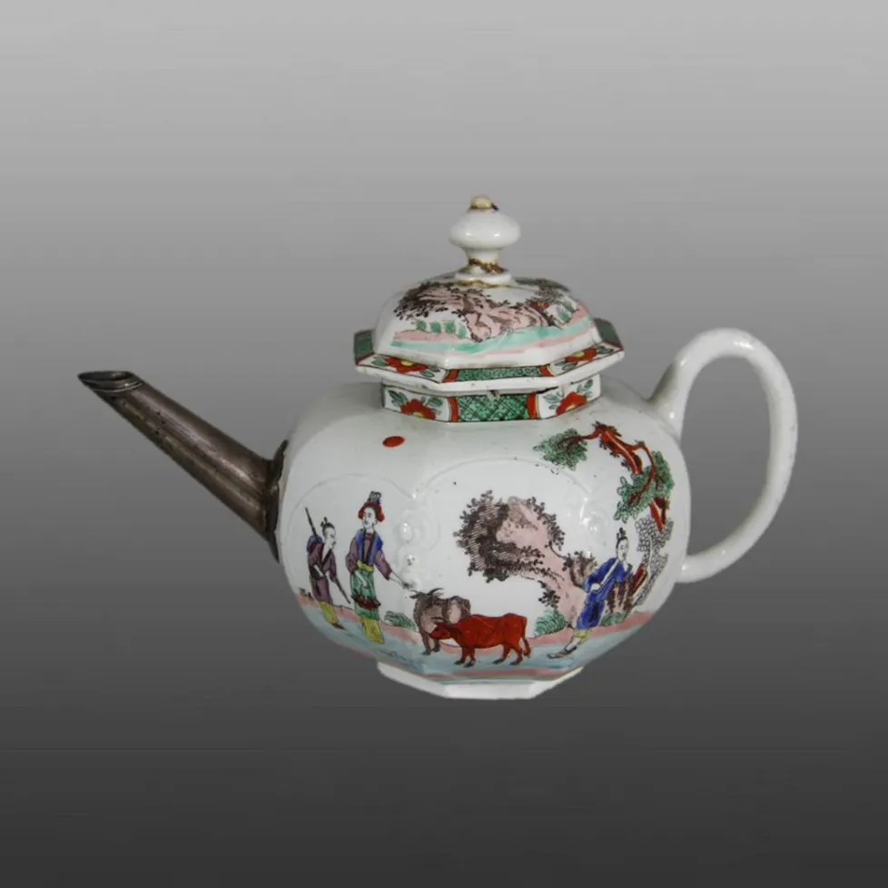 Teapot with six lobed cartouches separated by molding and with a replacement white metal spout.  This is one of the earliest printed patterns used by Worcester.  The transfer has a black out-line which has been colored-in by hand.  The borders are diaper patterns also taken from the Chinese originals.  The source is a rare Chinese design in famille rose from the Yongzhen period (1723-1735). It was copied faithfully