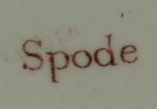 A small porcelain round sweep neck teapot and cover, in pattern number 2436, printed in brown over a gold panel with print number P.525 Convolvulus border from the Pluck and Dust Printed Series. Additional gilded decoration. Printed mark Spode in brown on base of teapot. Print reference Drakard, David and Holdway, Paul. Spode Transfer Printed Ware, 1784-1833. Woodbridge, Suffolk, Antique Collector's Club, Inc., 2002.BACK TO CATALOG INDEX
