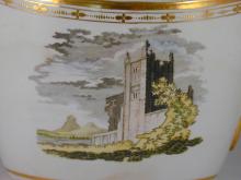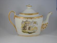 An oval tapered teapot bat-printed and colored with ruins in a landscape and trimmed with gold.The pot is of typical shape for Thomas Wolfe's factory which was previously known as factory Z.BACK TO CATALOG INDEX