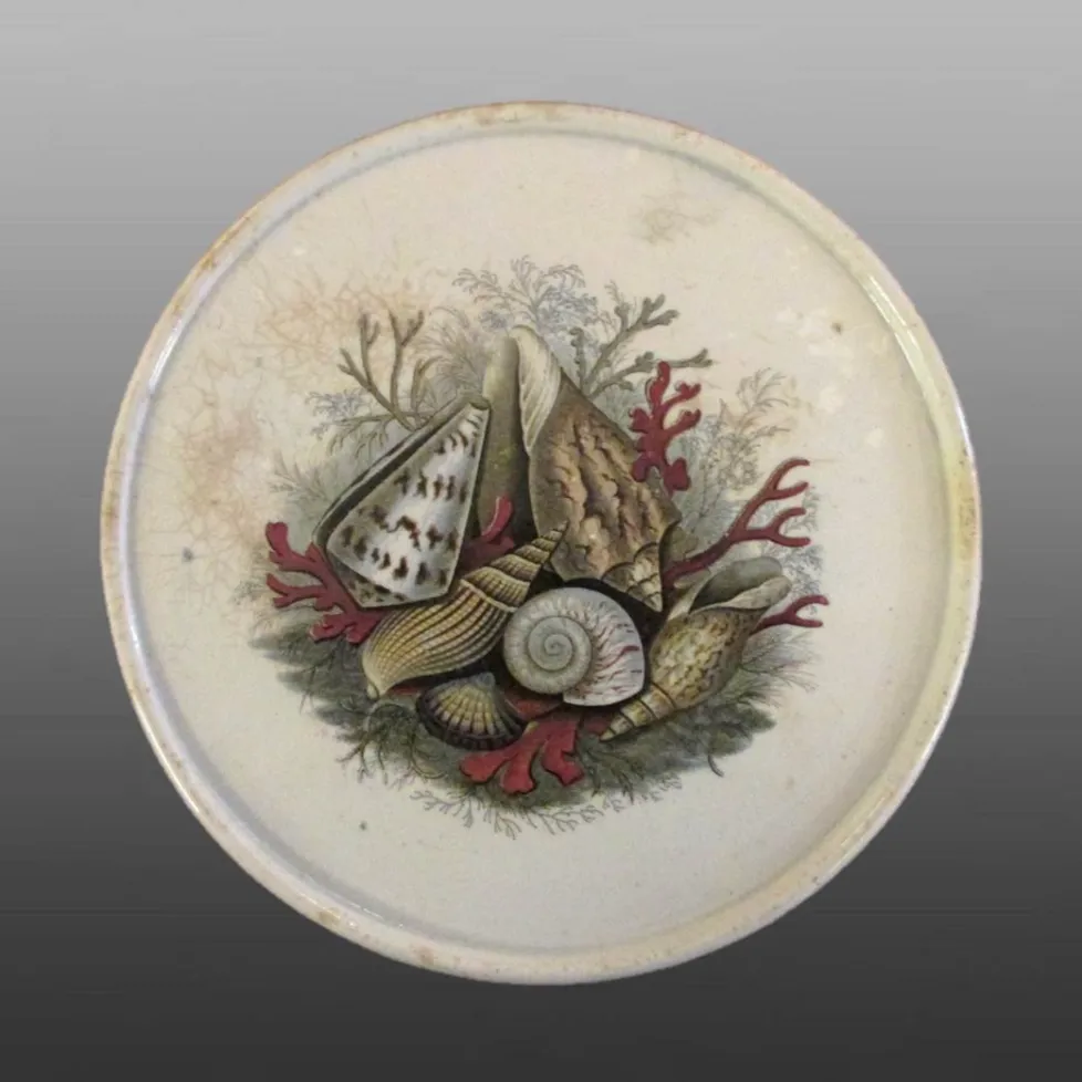 A teapot stand with three small feet. The center with multicolor print of shells.BACK TO CATALOG INDEX