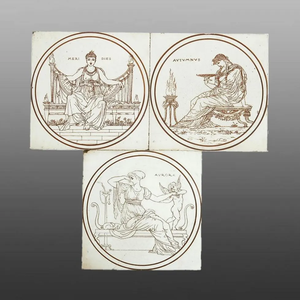 Earthenware tiles printed with scenes from the series 'Times of the Day and Months'. Each of these tiles depicts a Classical maiden in sepia on a white ground, titled 'Aurora', 'Autumnus', and' Meridies'. The tiles were designed by the Victorian artist and illustrator, Walter Crane (1845-1915) and a series, including further designs, was exhibited by Maw & Co. in the Paris International Exhibition of 1878. Literature - Hans Van Lemmen 'Decorative Tiles Throughout the Ages', Bracken Books, plate 21 for a reproduction of these tiles in a Maw catalog. An example of the 'Meridies' tile is held in the Ironbridge Gorge Jackfield Tile Museum collection.